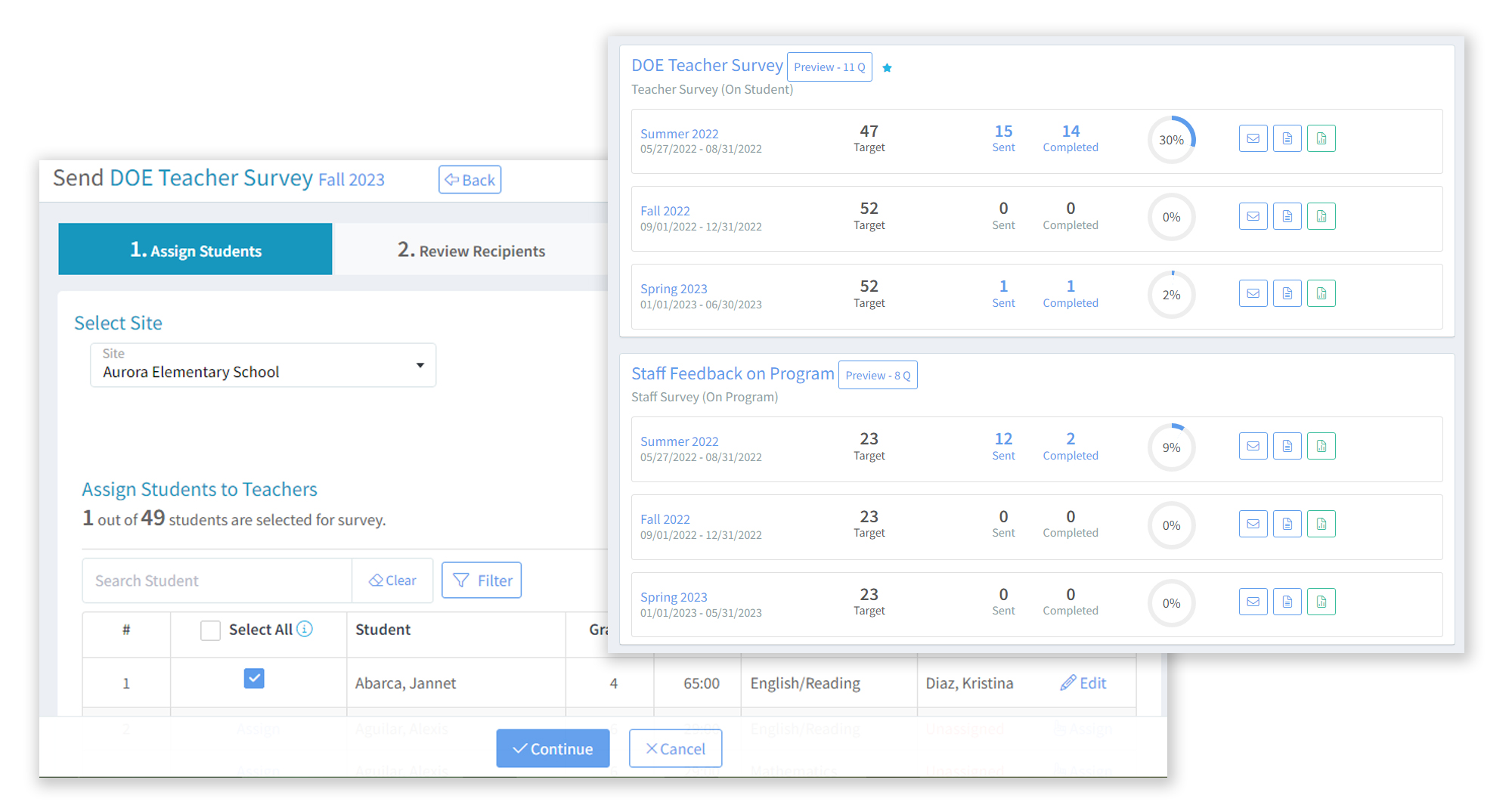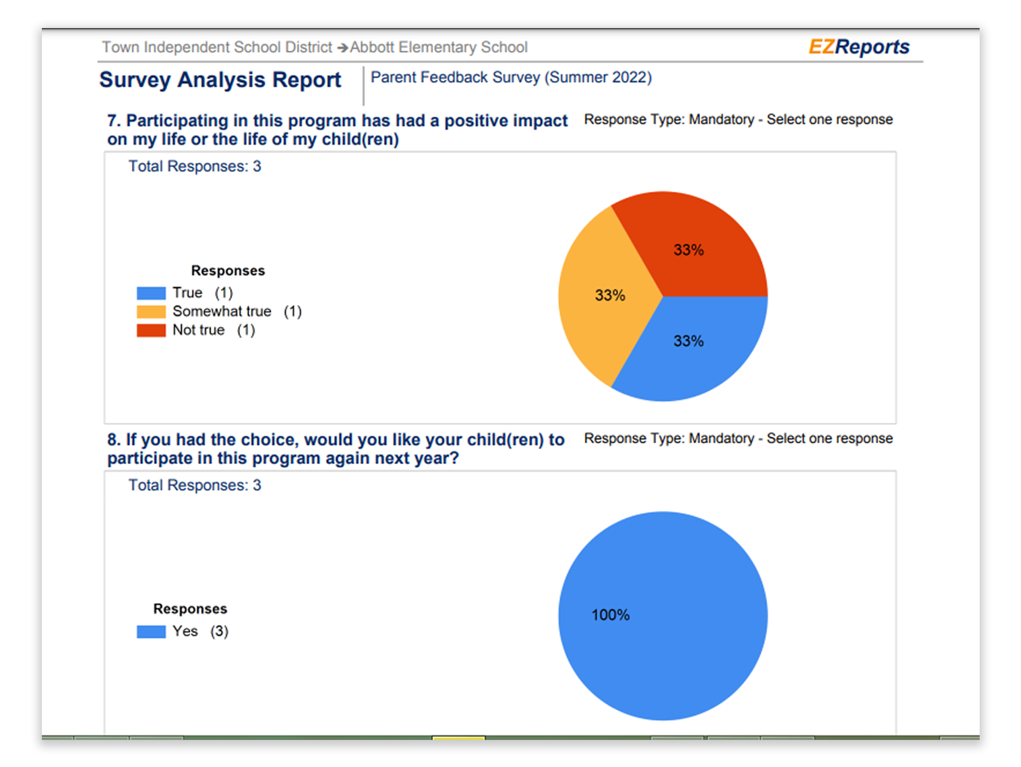 EZReports includes a custom survey module which allows the user to design their own surveys for teachers, parents, students, staff, and providers. The surveys forms are responsive so the user can easily complete the survey using a PC, iPad/tablet, or smartphone.